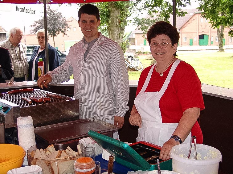 Der Wettergott zeigte sich in diesem Jahr von seiner gnädigen Seite, denn der verregnete Sommer 2004 machte beim Dorffest eine Pause und begnügte sich mit einem kleinen Schauer nach 22 Uhr. Wahrscheinlich war Petrus böse, weil die Feuerwehrkapelle schon vor 22 Uhr das Blasen eingestellt hatte und auch nicht zu weiteren Zugaben zu motivieren war. Diejenigen, die unter der Eiche ausharrten bekamen jedoch nicht einen Tropfen ab. Zur gleichen Zeit war die Luft im gut besuchten Festzelt zum Schneiden. So wunderte es auch keinen, dass die Tanzfläche kaum genutzt wurde.