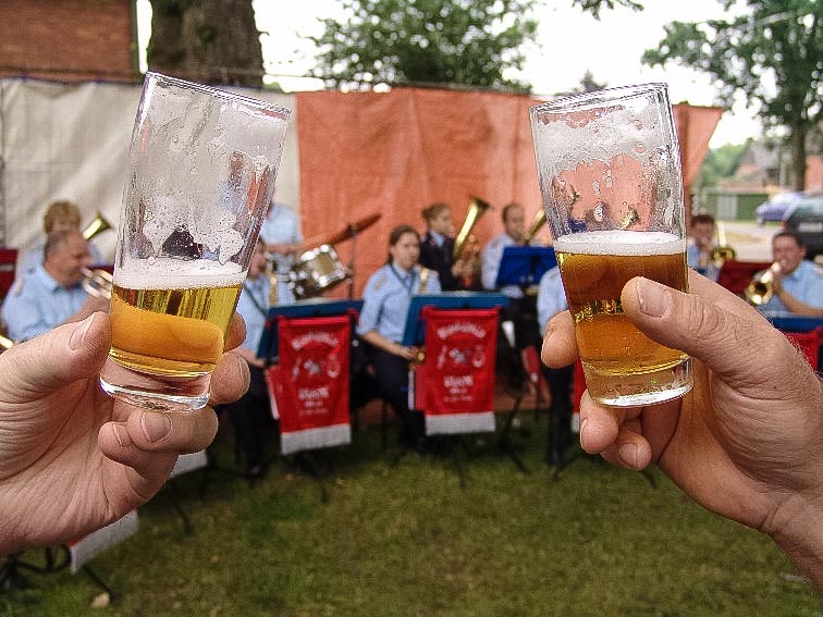 Nach all den Jahren mit Bildern vom abendlichen Dorffest wollen die Macher dieser Seiten diesmal Bilder ausschließlich vom Frühschoppen zeigen. Sie unterscheiden sich ja auch nicht so sehr von den abendlichen Bildern...... Vielleicht ist das Licht ja etwas heller! Die Besucher des Frühschoppens wurden diesmal durch die Musik der Feuerwehrkapelle aus Utecht bei Laune gehalten. Sie bewiesen, dass man auch in einer kleinen Besetzung eine gute Stimmung erzeugen kann.